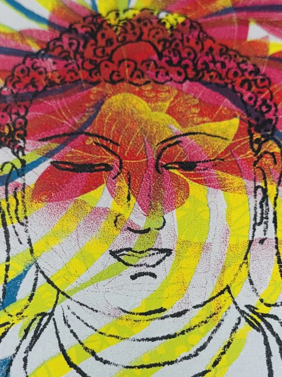 Using the same stencil as Rain Buddha, Nguyen incorporated the lace pattern in blue, a found photographic image of a lotus flower, and spiraling motifs from a larger print titled Rainbow Buddha.