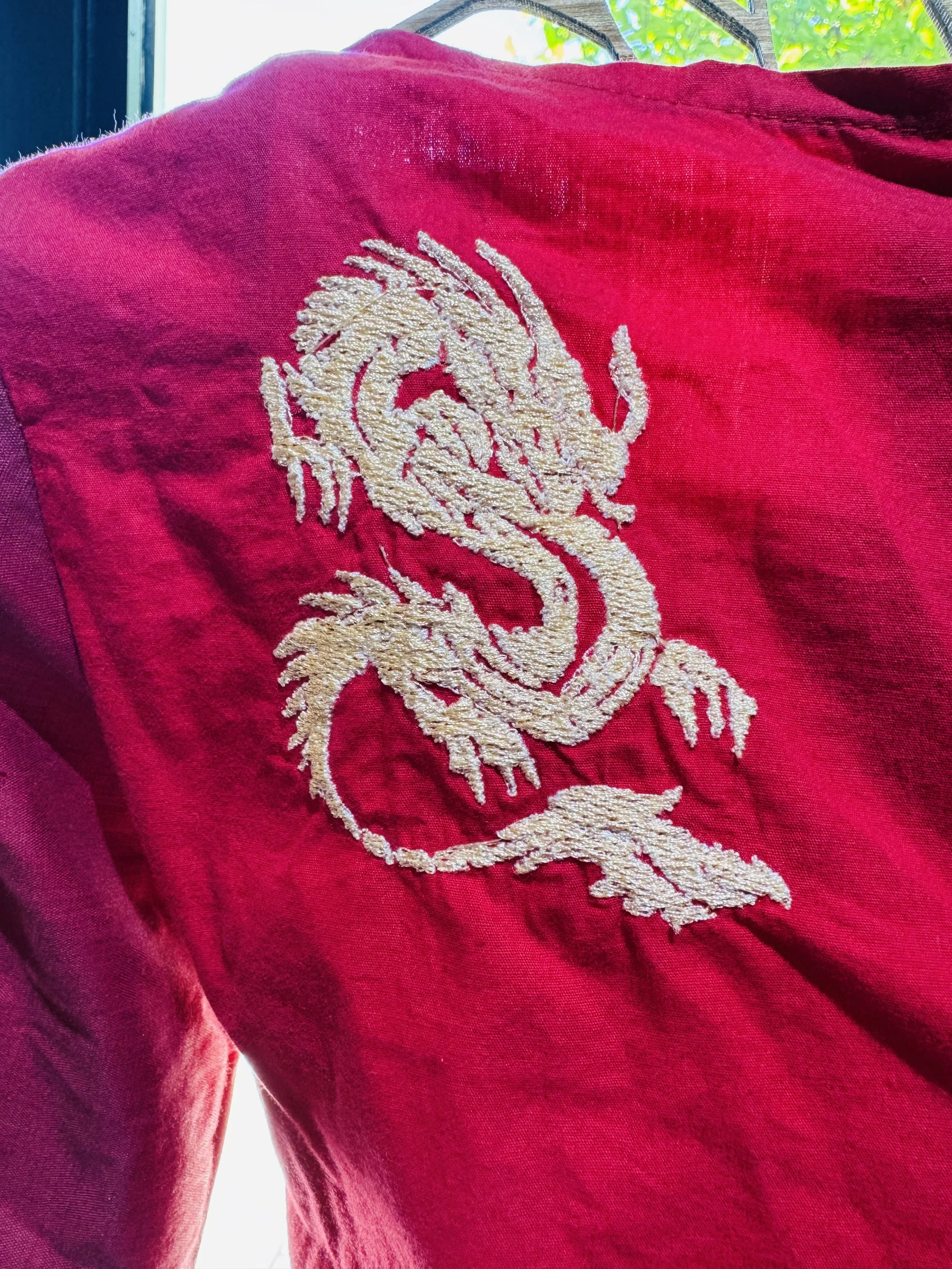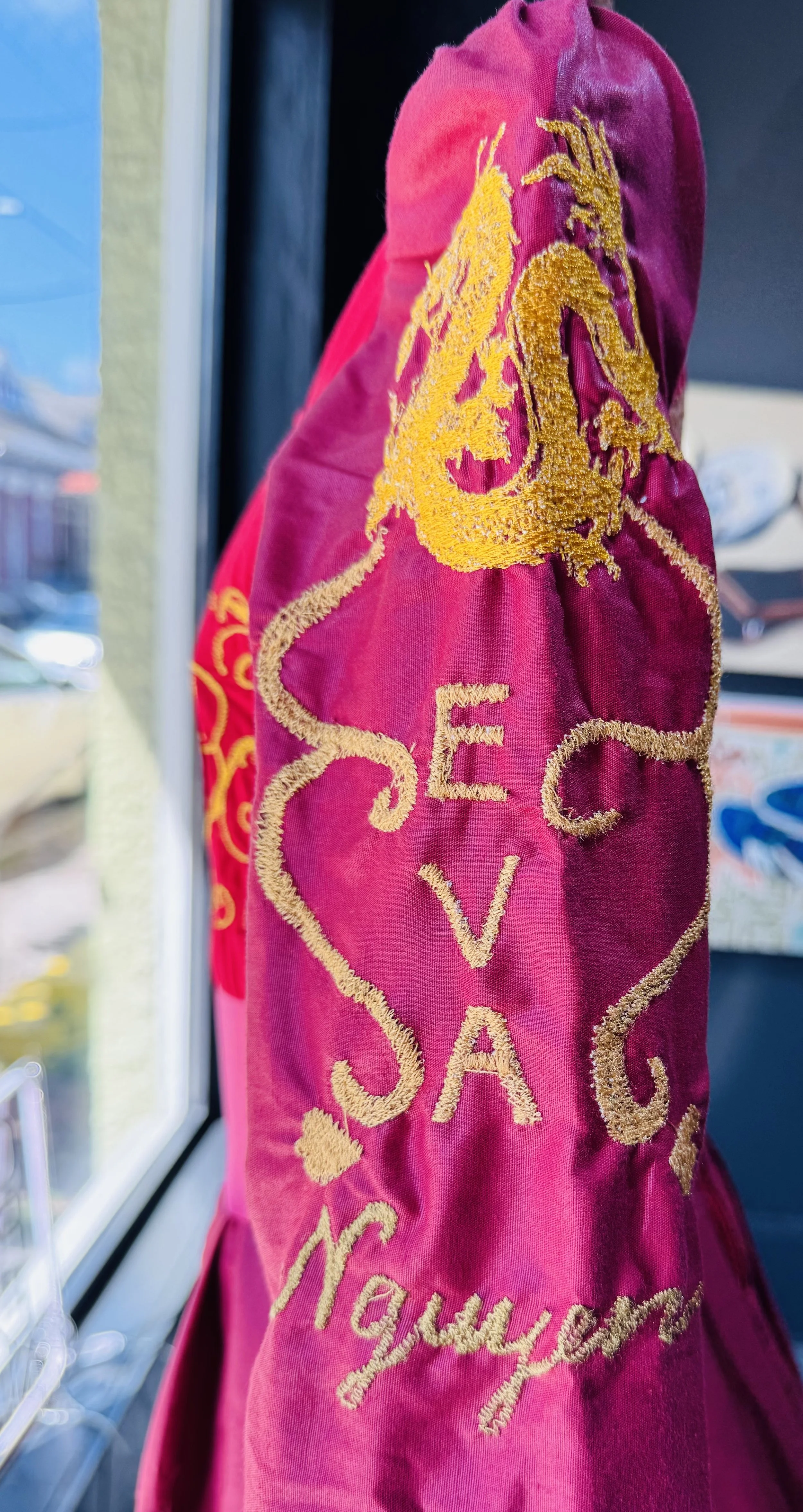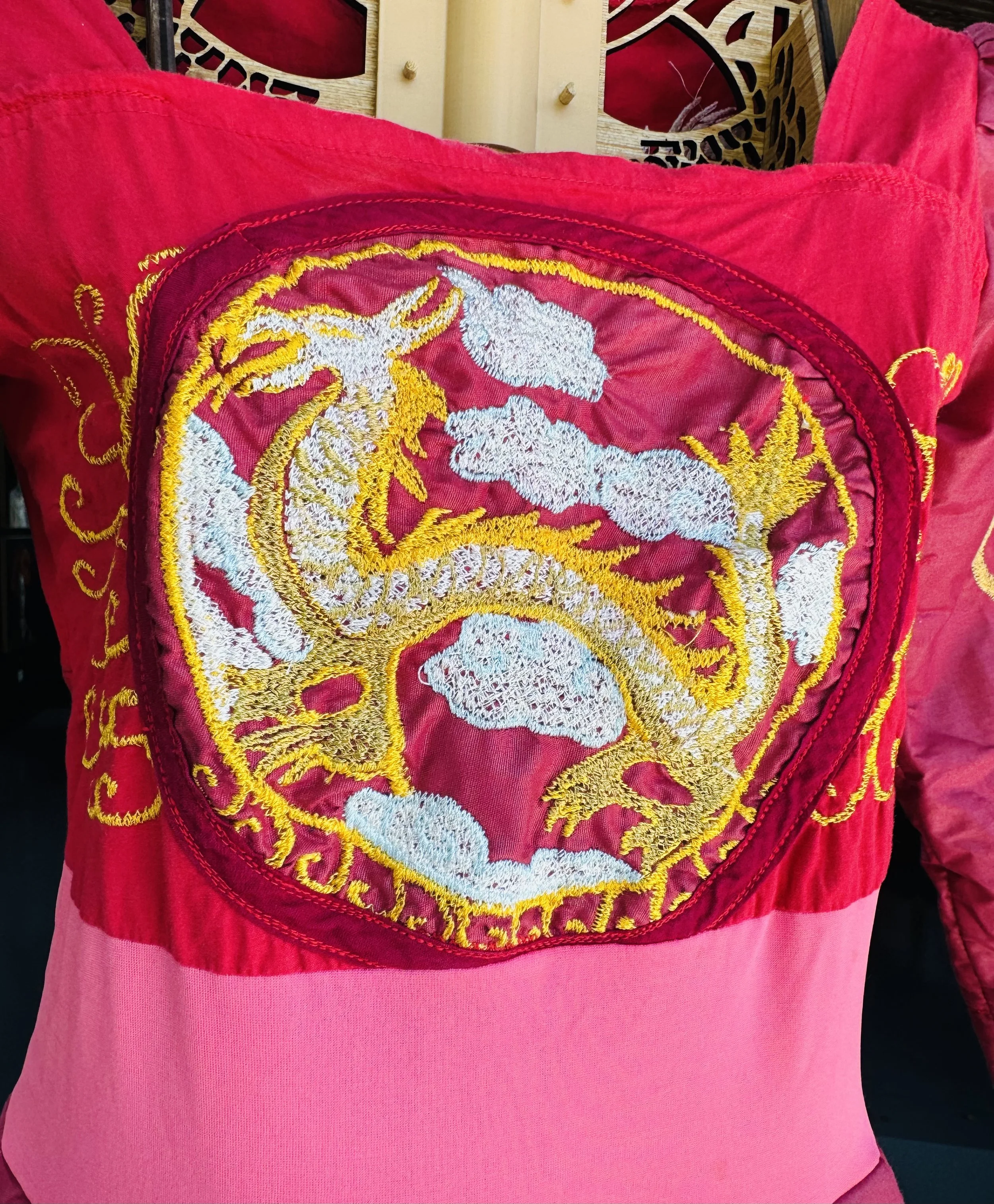 Nguyen created the Dragon Dress as an everyday dress that she occasionally wore. She has a difficult time finding clothes that match her unique style so she often makes her own clothing or alters clothes to match her vision. Nguyen makes dresses without the use of patterns or drapery techniques. She simply starts by measuring, cutting and sewing the shapes together. She made over 400 dresses and clothing in the first 3 years of living in the USA.